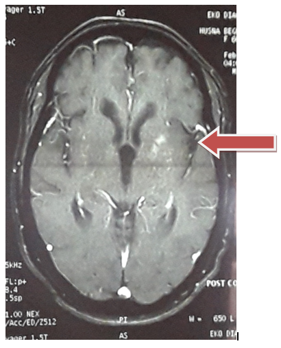 Figure 1 Generalised cerebral and cerebella atrophic changes are seen with ischemic leukoaraiosis. Left putaminal region is showing signal changes? metabolic in nature. Hyperintense lesion left basal ganglia region. Absence of other metabolic abnormalities & systemic processes like lupus, hyperthyroidism and uremia apart from uncontrolled DM. No History suggestive of Rheumatic fever. Plus, resolution of her movement disorder with control of hyperglycemia; led us to conclusion that-Chorea was likely due to uncontrolled hyperglycemia.