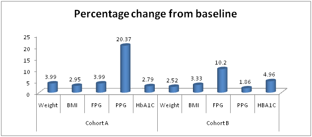 Baseline characteristics: A total of 63 patients, with 32 in cohort A and 31 in cohort B received liraglutide. There was no statistically significant difference in baseline characteristics namely age, duration of diabetes, height, weight, BMI, DBP, SBP, FPG, PPG and HbA1c between Cohort A and Cohort B (Table 1).