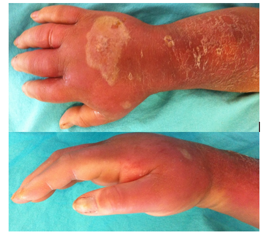 A 58-year-old female patient, with a history of type 2 diabetes, with a long history of poor medical management. She said she had not noticed any injuries in her hand. She went to medical examination for referring severe edema in the right hand, accompanied by erythema of predominance in the back, pain to the passive mobilization and paresthesias in the fingers. Upon examination, the patient had edema of fingers, pain in the trajectory of the tendinous sheath and pain to the passive extension Figure 1. Patient presented a palmar punctate lesion with a spine injuring the tendinous sheath of the 3rd deep flexor that was not treated on time and was generalized by developing an infectious tenosynovitis of the hand. Diabetic hand is an increasingly common condition in developing countries because a great percentage of its population suffers from this disease, in which there is peripheral neuropathy that generates inadvertent lesions that are usually infected with multiple bacteria.