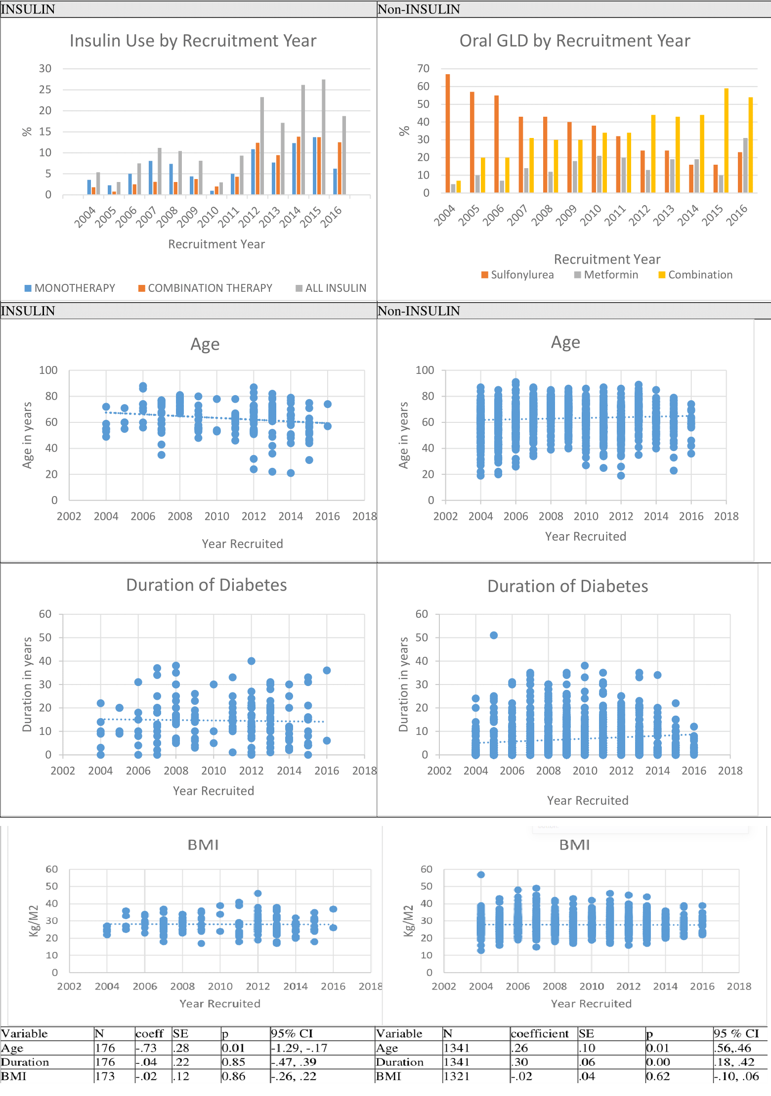 Baseline characteristics of adult female diabetics receiving insulin vs. the non-insulin-treated cohort are summarized in Table 1. The mean age of study participants was 63 years (±11.8, range 19-91), with a majority considered as indigenous but multiracial and married or cohabiting (68%). Although the demographic, anthropometric, and gestational characteristics of the two groups were similar, insulin treated subjects differed in important diabetic, metabolic and co-morbid characteristics from their counterparts. Approximately one-third of the population belonged to the highest socioeconomic strata; subjects receiving insulin had more missing socioeconomic information and somewhat lower socioeconomic ranking.