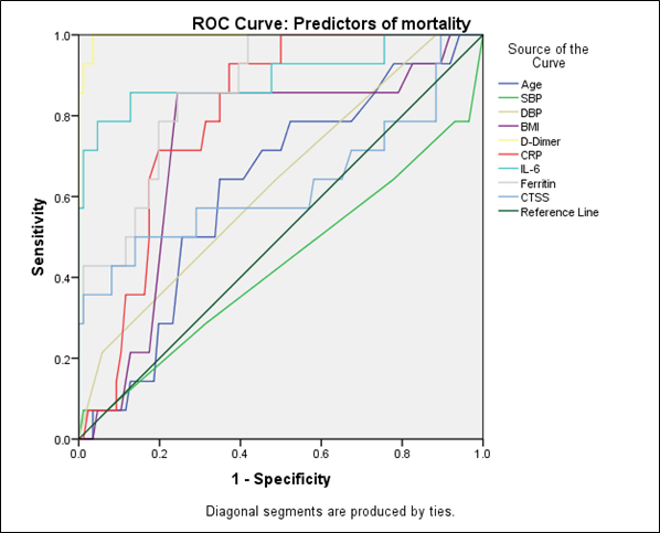 D dimer was the inflammatory marker which had the highest predictive value for mortality, the primary outcome,with an asymptotic significance of <0.001 and the area under the ROC (receiver operator curve) being1.00. Ferritin, Interleukin-6 and CRP all showed fair to excellent predictability for mortality with the asymptotic significance being < 0.05 for all. Although not a biochemical inflammatory backreacts also had an asymptotic significance of.003 and also came out as a fair to excellent marker for predicting the primary outcome that is mortality in COVID-19 infected diabetic patients. (Table 3 & 4) (Figure 1)