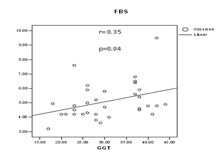 Figure 1 showed significant a positive correlation between FBS and GGT level in GDM group, Pearson Correlation value was 0.35 that means 35% possibility when GGT increased than FBS increased, which was statistically significant (p?0.05)