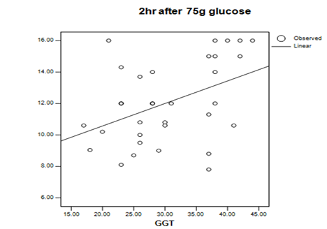 Figure 3 showed a significant positive correlation between 2hs PBOGTT and GGT level in GDM group, Pearson Correlation value was 0.42 that means 42% possibility when GGT increased than 2hs PGOGTT level increased, which was statistically significant (p?0.05).