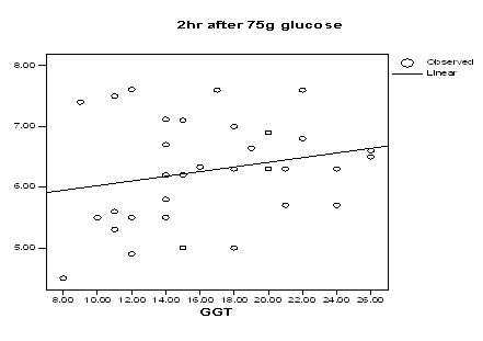 Figure 4 showed significantly a positive correlation between 2hs PGOGTT and GGT level in normal pregnancy group, Pearson Correlation value was 0.22% that means 22% possibility when GGT increased than 2hs PGOGTT level increased, which was statistically not significant (p?0.05).