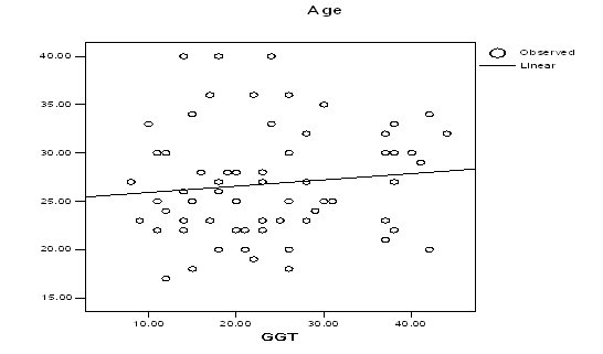 Figure 5 shows a correlation between age in years and GGT. Pearson Correlation value was 0.11 that means 11% possibility when age in years increased than GGT increased, which was not statistically significant.