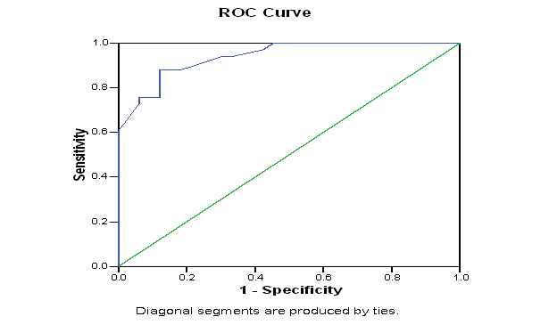 The test results variable (s): GGT (0.94) has at least one tie between the positive actual state group and the negative actual state group. Ninety five % confidence interval of the difference was lower -0.889 and upper -0.991. The test results variable(s): GGT (0.94) has at least one tie between the positive actual state group and the negative actual state group. Sensitivity was 98% and specificity was 50%. Ninety five % confidence interval of the difference was lower -0.889 and upper -0.991. Cut off value was19.50 (Figure 6).