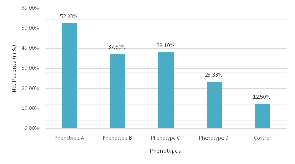 Prevalence of metabolic syndrome in different phenotypes and control groups is given in Figure 1. There were 28, 6,8,7,4 subjects with metabolic syndrome in PCOS phenotype A, B, C, D and control respectively. Metabolic syndrome was highest in phenotype A (52.83%). All phenotypes had higher prevalence of metabolic syndrome than control subjects.