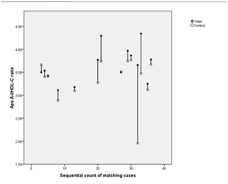 Table 3 shows the results of a conditional logistic regression model considering albuminuria as the outcome variable. In the final model Apo A-1/HDL-C ratio was significantly (P=0.036) associated with microalbuminuria. The Apo A-1/HDL-C ratio and sex interaction also, showed a borderline association (P=0.054). Other included variables, however, did not have any significant association with microalbuminuria. Figure 1 illustrates the interaction between Apo A-1/HDL-C ratio and sex. Figure 1 suggests that microalbuminuric females have higher Apo A-1/HDL-C ratio compared to their normoalbuminuric counterparts while such association is not observed in the male group.