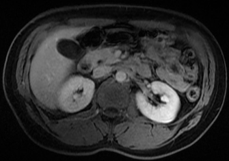 Subsequently, the patient reported a similar episode a year ago while riding a bike, which resulted in a wrist fracture. However, it was not studied by then. During his hospitalization the patient presented repeated episodes of hypoglycemia, so studies were expanded, a lipid profile, thyroid function, and plasma cortisol were performed, all of which were normal, and possible infection was ruled out. It was evaluated in conjunction with the endocrinology service, who indicated imaging studies and a 72 hours fasting test because of insulinoma suspicion. Computed tomography (CT) with abdominal contrast and magnetic resonance cholangiopancreatography (MRCP) were performed, showing a cystic image in the liver without other significant anomalies (Figures 1 and 2). A 72-hour carbohydrate fasting test was performed, which ended after 14 hours due to symptoms of hypoglycemia and fingerstick blood glucose of 36 mg/dL (2 mmol/L). Laboratory tests were taken immediately, confirming venous blood glucose of 35 mg/dL (1.94 mmol/L) and insulin of 46.7 uIU/mL (high, reference range 2.6 - 25 uIU/ml). Then dextrose intravenous was administered and the symptoms resolved. Unfortunately, in our hospital there is no availability to measure C-peptide, beta-hydroxybutyrate, proinsulin levels and anti-insulin antibodies.