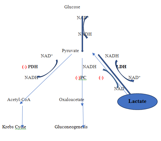Figure 1 Metformin induced lactic acidosis and pyruvate metabolism. Metformin has multiple mechanisms of action. Under normal conditions, gluconeogenesis consumes pyruvate through pyruvate carboxylase. Biguanides inhibit pyruvate carboxylase, thereby causing pyruvate to accumulate. Increased amounts of pyruvate are then converted to lactate via lactate dehydrogenase. Conversely, biguanides also inhibit conversion of lactate back to pyruvate for use in gluconeogenesis.13