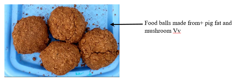 Figure 1 Granulated feed (FACI ® ) incorporating pig fat and the mushroom volvariella volvacea (Vv) purchased at the Abobo market in Abidjan-Cote d'Ivoire.