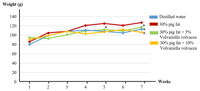 In this work, consumption of Vv mushroom incorporated at 10% in the diet significantly slowed down body weight gain in rats compared to rats consuming the fatty or positive control diet (16.50% vs 41.25%; p < 0.05). This finding was also made by Zoho18 who showed 75% and 100% of this Vv mushroom in the diets caused a decrease in body weight and abdominal fat in Wistar rats, so it can be proposed as a dietary regimen for obese people.16 Again, body weight gain was significantly reduced by 25% when adding 20% Shiitake mushroom powder to a hypercholesterolemic diet for 25 weeks in obese rats.19