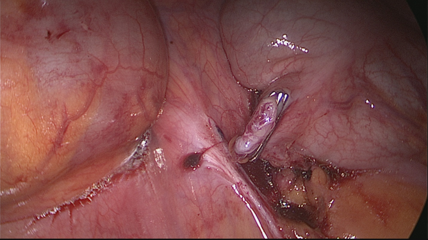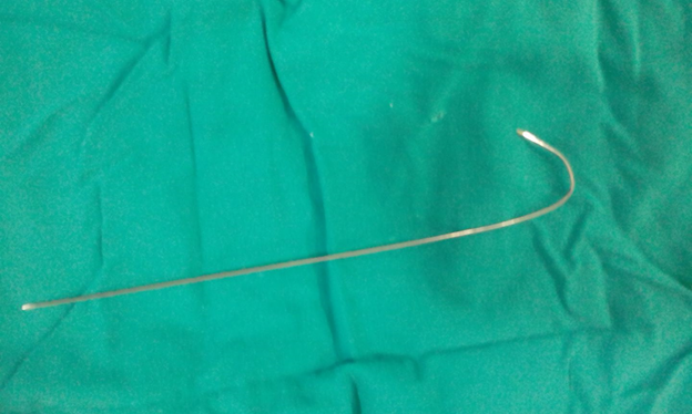Under general anesthesia the patient is positioned in Trendlenberg position and tilted slightly to the right side, a 30-cm length of Key wire is fashioned to have a hook at one end and the other part is the straight part has small handle at the end to manipulate the hook (Figure 1). This is inserted easily through the right iliac fossa, the appendix is grasped by the grasper passed through the suprapubic port and the tip of the hook is passed through a window created in the mesoappendix (Figure 2) This retracts the appendix to the abdominal wall. With Ultracision Harmonic Scalpel (® Ethicon, Cincinnati, USA) mesoappendix is cauterized. Then the hook was used to sling the appendix through the tip of the appendix and two large clips were applied to the appendix at the base of the appendix, and another one 10mm from them, and we cut the appendix in between (Figure 3). Then the hook is removed ,the excised appendix is extracted it through the camera port. After peritoneal lavage, the two port sites are closed. Follow up for six months.