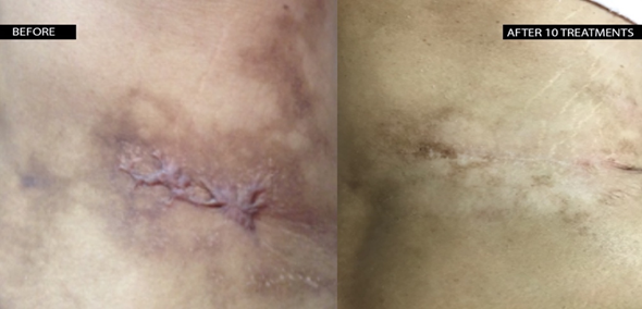 Two subjects treated for Keloids, showed significant improvement after six treatments with no reoccurrence of the keloid scar for a period of three years following the treatments (Image F).