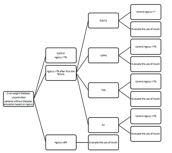 The layout in this Figure is the natural evolution of Overweight Diabetes Uncontrolled Diabetes patients without diabetic education based on HgA1c measures. Each box corresponds to one or more states in the HgA1c levels. Parts of the model is that baseline the patient have metformin, if we have less than 7% of HgA1c means control and need evaluation after 3 months, if their parameters are higher 7% we add in the second line the dual therapy with the four options study if in the study the HgA1c>9 we directly evaluate the use of insulin.