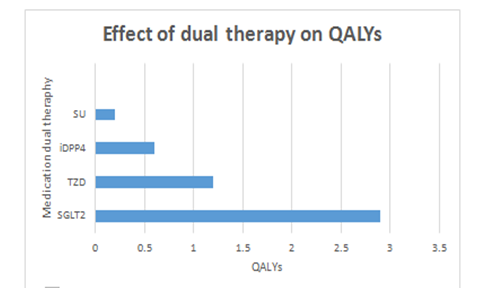 Results: The dual therapy options iSGLT, TZD, IDPP4, and SU were used to reduce the relative risks of high HgA1c levels and represent a control for each 3month evaluation. Following glycemic control, we improved QALYs in terms of years without insulin (0.046), which resulted in lower costs per patient ($956). The impact of iSGLT on weight was high with estimates of relative risk reductions (p<0.001) and QALY gains. iSGLT and IDPP4 were more expensive than others, but QALYs were better for these drugs. Among these two drugs, iSGLT2 achieved better QALY with long-term use.