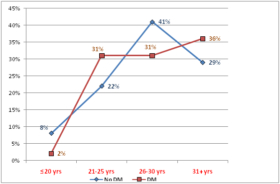 This is a prospective, case-control hospital-based study carried out in Omdurman Maternity Hospital and Omdurman Military Hospital in Khartoum State, Sudan. The study conducted during the period from September 2014 to March 2015. The cases sample included a full coverage of all diabetic pregnant women attended to the medical centers during the study period. All cases were post-diagnosed with DM. Controls were selected form healthy pregnant women with normal glucose tolerance, after they were universally screened with non-fasting 2hour 75gm glucose tolerance test (GTT) (<140mg/dl). Pregnant women with GDM diagnosed 2hour 75gm GTT was ≥140mg/dl were advised for medical supervision. Pregnant women with previous history of other medical illness like anemia, smoking, alcoholism, human immunodeficiency virus (HIV), cardiac, renal disease, other chronic diseases and medical treatment were excluded. Adolescents and those over age 45 were also excluded because pregnancy in those age groups is considered to be high risk.