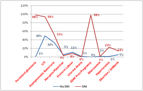 Results: Clinical complications when compared to normal pregnant women (control group), diabetic pregnant women (case group) showed significant increase in incidence of persistent glycosuria (GU), urinary tract infection (UTI), hypertension, GD in previous pregnancy, abortion/stillbirth and asymptomatic bacteriuria (AB), (P value <0.001, 0.001, 0.001, 0.001, 0.030 and 0.007 respectively). GU (98% in cases versus 1% in controls), UTI (94% in cases versus 49% in controls), hypertension (23% in cases versus 1% in controls), GDM in Previous Pregnancy (98% in cases versus none in controls), abortion/stillbirth (14% in cases versus 5% in controls) and AB (53% in cases versus 34% in controls).