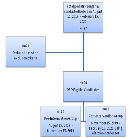 This was a quantitative pre-intervention and post-intervention study which was conducted at a 501-bedacademic community hospital between August 15, 2019–February 15, 2020. The study was approved by the hospital administration in accordance with the quality assurance policy. This project was considered a quality improvement (QI) project; thus, IRB approval was not deemed necessary. No direct patient identifiers were maintained in the study database. An electronic dashboard was created from the electronic health record EPIC to capture podiatry surgeries conducted during the 6-month period of this study at the hospital. Inclusion criteria included DFO patients who underwent surgical amputation with bone removal that required IV antibiotics upon discharge and required a PICC line to be placed under the care of the hospital medicine attending service. The exclusion criteria included patients without DFO, no podiatric bone surgically removed, no IV antibiotics upon discharge or no PICC line placed. In addition, exclusion criteria extended to include that that had PICC line placed before podiatry surgery amputation, or patients who underwent surgery at an adjacent campus, or taken care of by internal medicine residents. Lastly, this study population excluded patients with a complicated hospital stay who stayed in the intensive care unit stay, expired in the hospital, or who left the hospital against medical advice. Pre-intervention data was collected from August 15, 2019–November 15, 2019, and the post-intervention data was collected from November 16, 2019–February 15, 2020. A total of 26 patients met the inclusion criteria, of which 14 patients were in the pre-intervention group and 12 were in the post intervention group Figure 1.