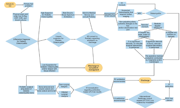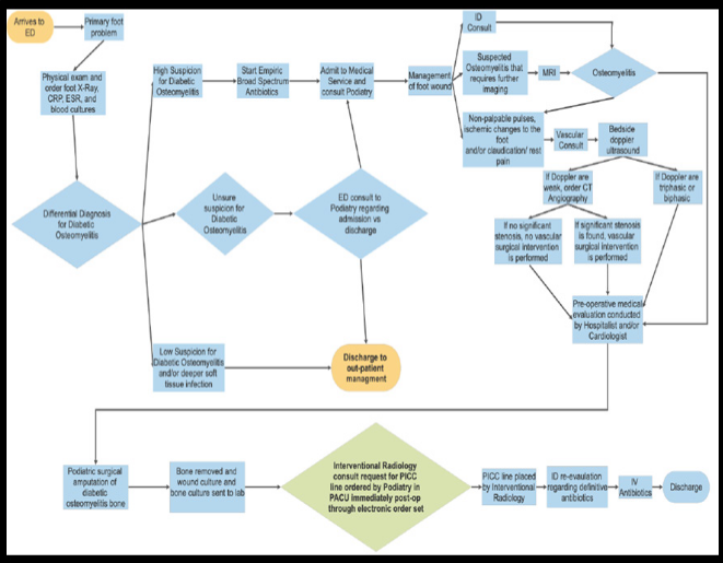 Approximately 40-80% of all diabetic foot ulcers (DFU) lead to diabetic foot infections,1–4 20% of these DFUs go on to develop diabetic foot osteomyelitis (DFO).1–5 Patients with DFO often require hospitalization for surgical excisional debridement of infected bone and at times the discharge process is delayed as patients await antibiotic sensitivities for long term intravenous (IV) antibiotics.6 Prior studies have demonstrated a correlation between increased patient length of stay with an increased susceptibility to acquiring hospital related illnesses and iatrogenic complications,7–11 as well as creating bottlenecks in the emergency department (ED) for patients awaiting hospital beds.12–14 Therefore, orchestrating a safe, unified and efficient multidisciplinary discharge protocol for patients has benefits for both patient outcomes and workflow for the healthcare system. Healthcare organizations can use industrial improvement methodologies for process improvement to enhance patient quality and safety, and reduce wasteful steps.15–20 Lean is a change strategy commonly used in healthcare to eliminate wasteful steps and improve workflow to benefit the patient.21–23 Hung et al.,22 showed that successful implementation of Lean requires leaders to consider the contextual factors that surround efforts to implement Lean in a particular setting. Nicosia et al.,19 noted the positive effects of implementing Lean Methodology principles to increase efficiency in the inpatient discharge process by engaging the entire team in the workflow process.19 Wertheimer et al.,24 presented how implementing key steps in the discharge process using Lean methodology were able to significantly reduce patient length of stay and increase patient discharge before noon.24
