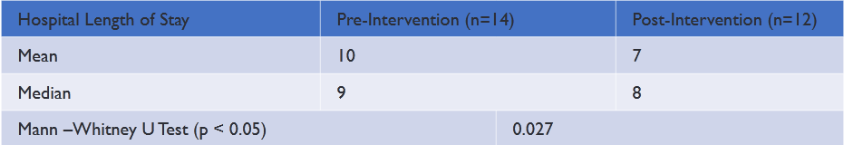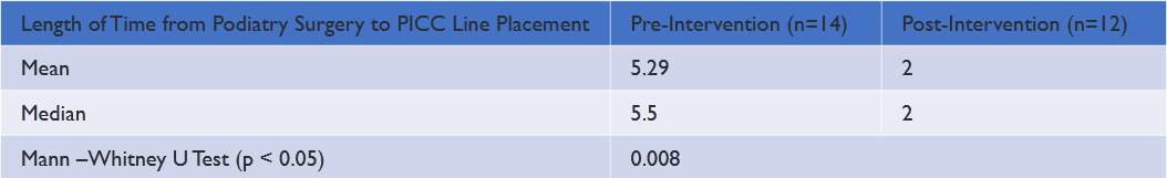 The main outcome measures for the pre-intervention and post-intervention group were total length of stay (LOS) for each DFO patient and total length of time between podiatry surgery and PICC line placement. Data was imported from the electronic dashboard into Microsoft Excel and reviewed based on inclusion and exclusion criteria. Frequency data for the LOS was plotted for the pre-intervention and post-intervention group on a histogram. Similarly, frequency data for the length of time from podiatry surgery to PICC line placement for the pre-intervention and post-intervention group was also plotted on a histogram. Both histograms depicted a non-parametric distribution. The Mann-Whitney U test was selected to compare differences of means between the pre-intervention and post-intervention groups for both the LOS and length of time from podiatry surgery to PICC line placement.IBM® SPSS Statistics software was used to assess if there was a statistically significant impact (p-value<0.05) on the reduction of the overall LOS and if there was a reduction in the time between podiatry surgery and PICC line placement for the pre-intervention and post-intervention groups.