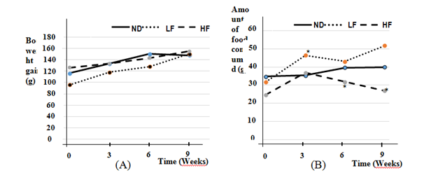 Similarly, body weight gain in the animal correlated with the amount of food ingested (g/d). Thus, the LF rats have consumed an average of 42, 75±5,7g/day while those of the normal group (ND) and experimental (HF) consumed respectively, 38.5±25 and 27.5±3g/day (Figure 1B).