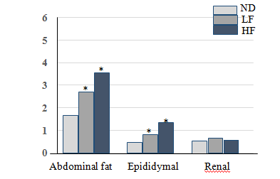 The average weight relative adipose tissue (abdominal and epididymal) have been reported in percentage (%) of body weight of rats following the animals dissection at the end of the experiment. The percentage of abdominal adipose tissue of HF rats was significantly higher than rats receiving normal (ND) and experimental LF diet (3.5±0.9% vs 2.9±0.6% and 1.8±0.7%; p<0.05). The percentage of epididymal adipose tissue was also greater in HFrat than Normal (ND) and experimental (LF) rats (1.4±0.30% vs 0.79±0, 06% and 0.75±0.04%;p<0.05) (Figs. 2 and 3). However, perirenal adipose tissue didn’t show a significant difference between all groups of rats (0.8±0.05% vs 0.7±0.08% and 0.75±0.04%; p>0.05).