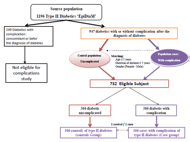 The control: All diabetic patients in our cohort with no complications represented our target population controls. Were defined as controls for this study; diabetic with no complications of diabetes at the time of inclusion in the cohort. Controls were matched to cases on age (± 5 years), sex and diabetes duration (± 5 years). We excluded patients with complications indeterminate situation (Figure 1).