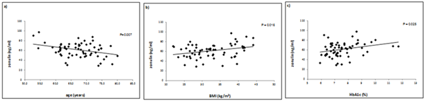 The most important demographic findings and laboratory results obtained from the patients and nondiabetic controls in this study are presented in (Table 1). With a mean duration of 13 years, the diabetes patients had already been suffering from the disease for a relatively long period of time. As anticipated, BMI, triglyceride levels, and insulin resistance (HOMA-IR) were higher in these patients as in controls. Due to the higher frequency of statin therapy in the diabetes patients, the cholesterol values were lower in these patients. The remaining laboratory values showed no significant differences. Gliadin antibodies were not detectable in any of the study participants. The exploratory survey of the patients’ nutritional habits revealed that none of the study subjects was on a vegetarian or vegan diet. Regarding to the antidiabetic medication: most patients (73%) were taking metformin, 34.9% received DPP4 inhibitors or incretin mimetics and 17.5% sulfonylurea agents. One half of the patients (55.6%) were on insulin therapy. The mean zonulin concentrations in diabetes patients were at 58.8±15.4 ng/mL significantly higher than those measured in nondiabetic controls (42.2±9.5 ng/mL); (Figure 1A). Elevated zonulin concentrations, i.e. > 60 ng/mL, were detected in over one half of the patients (Figure 1B). The results of the regression analyses between zonulin concentrations of diabetic patients and various demographic and laboratory parameters are shown in (Table 2). Zonulin concentrations increased proportionally to increasing obesity and increasing HbA1c levels, but decreased with rising age (Figure 2A). The correlation between zonulin concentration and the logarithmized hsCRP values was only of borderline significance (p=0.067). No correlation was found between the zonulin concentration and other metabolism parameters such as insulin resistance (HOMA-IR) and the lipid values. A significant correlation was detected between zonulin and renal-function parameters, for example a significant positive correlation between zonulin concentration and eGFR and a negative correlation between zonulin and UACR (Figure 2B). In multiple regression analyses under the inclusion of age, BMI, HbA1c, eGFR, and UACR as independent variables, only the correlation between zonulin and UACR remained significant (Table 3). No correlation was detected between the zonulin concentration and the type of diabetes therapy. Here the zonulin concentrations in patients with and without insulin (60.9±16.3 vs 62.1±12.2 ng/mL) and respectively with and without incretin-based therapy (63.1±9.8 vs 60.6±16.5 ng/mL) did not differ.