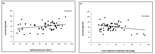 Results: More than one half of diabetic patients (58%) exhibited elevated serum zonulin levels compared to nondiabetic controls. Regression analyses showed a significant positive correlation of zonulin concentrations to BMI and HbA1c, but not to insulin resistance or lipids. A significant positive correlation was found between zonulin and eGFR, alongside a significantly negative correlation to proteinuria (UACR). Taking several confounders into consideration, UACR remained an independent factor of influence on the zonulin concentration.