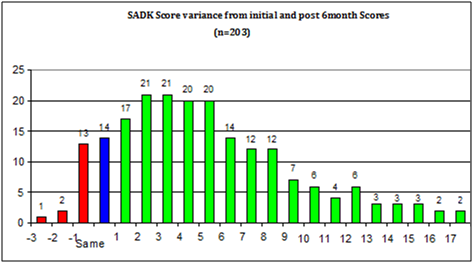 In Figure 2: A total of n=57 (28.1%) out of n=203 course attendees completed the SADK Questionnaire at 6 months post course. N=46 (81%) out of n=57 had improved from their scores on the initial questionnaire, 5 (9%) had scores that remained the same, 6 (10%) had scores that decreased: