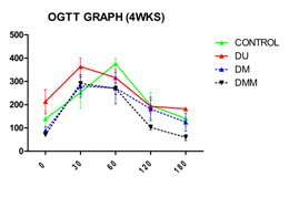 (Table 7) below shows the glucose level of control, DU, DM and DMM groups at 0, 15, 30, 90, and 120 minutes during the insulin tolerance test week 4. At 0 minutes, the glucose level of DU and DM was significantly (p<0.05) higher when compared with CONTROL. At 15 minutes, there was a significant (p<0.05) increase in DM and DMM but significant (p<0.05) decrease in DU when compared with CONTROL. After 30 minutes, DM decreased significantly (p<0.05) when compared with CONTROL. After 90 and 120 minutes, there was a significant (p<0.05) decrease in DMM when compared with DU (Figure 7).