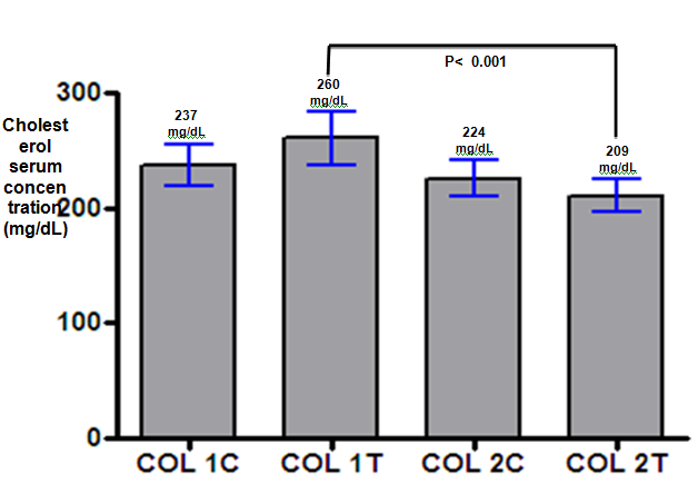The initial concentration of cholesterol before treatment in the experimental group was 270 mg/dl, this value decreased significantly after one month of intake of Opuntia Cactaceae to 205 mg/dl ( P <0.05). This result is highly relevant because it’s possible that the intake of Opuntia Cactaceae exerts a direct hypocholesterolemic effect (Graph 2 & Table 2).