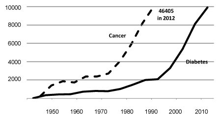 There is no denying the ever increasing effort applied to diabetes research. This effort can be very crudely quantified by searching PubMed for all articles containing the word “diabetes” in the article title (Figure 1). This shows a steady rise in the number of research articles with a marked upturn occurring from the mid 1990s. If you do the same for “cancer” the numbers are around 20times greater for each year searched. There seems to be clear benefit to this research effort, at least in affluent societies, with improvements both in cancer survival rates and mortality as a result of diabetes. For example, increases in the quality of health provision and monitoring seem to have reduced mortality of type 2 diabetes in Denmark,1 Iceland2 and Germany.3 Despite this, the serious issue facing us today is still the ever increasing incidence of type 2 diabetes worldwide; countries that cannot afford the luxuries of expensive care programmes are very worried by what they perceive as a continuation in rising mortality of diabetes.4