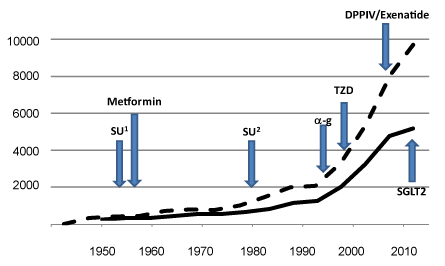 Even in the developed economies, type 2 diabetes treatments are causing huge strains on existing health service provision and expenditure. The charity, Diabetes UK, estimates that £10bn was spent on type 2 diabetes in 2010 with hospitalisation consuming around 80% of that money5 and that in the UK some 700 patients are newly diagnosed with diabetes every day.6 Costs are anticipated to rise to a staggering £16.9bn by 2035. In the rest of the world there is predicted to be 366million people with diabetes by 2030.7 The largest increases will occur in economies that will struggle to provide the type of care that northern Europe might enjoy. In the absence of a miracle lifestyle programme, safe, effective and economical medicines must the answer to prevent even advanced healthcare systems from being overwhelmed; the very effective “cure” of Roux-on-Y bariatric surgery8 cannot be deployed to millions of people.