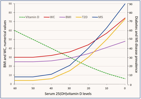 Figure 1 Inverse correlations of decreasing levels of serum 25(OH) vitamin D [25(OH)D] levels with the prevalence of type 2 diabetes (T2D) and metabolic syndrome (MS); the latter has the most predominant relationship. Negative correlations of 25(OH)D are higher with the waste circumference (WC; abdominal girth) in comparison to the body mass index (BMI). Direct or indirect associations of varying levels of serum 25(OH)D with four indices are presented in the figure. Graphic presentations are based on best estimates and construct on hypothetical basis (thus only in approximation). Broken green line represent the changing serum 25(OH)D levels.