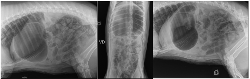 Figure 1 Right lateral (A), ventrodorsal (B), and left lateral (C) abdominal radiographs showing severe gas dilation of the stomach and moderately to severely diffusely dilated intestines with gas and soft tissue opaque material. In the left lateral projection (C), an amorphous and heterogenous soft tissue and gas opaque feature is noted in the proximal duodenum.