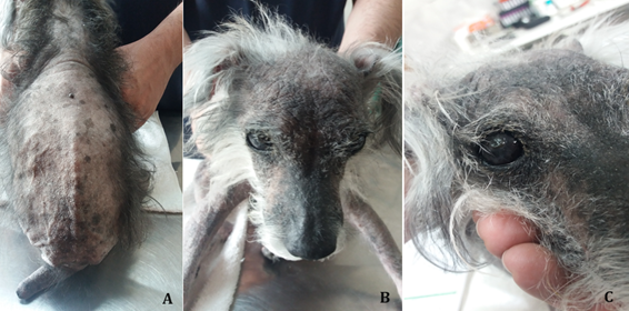 In December 2023, a twelve-year-old, female, neutered and vaccinated dog, Schnauzer, was attended. The owner reported that the animal represented apathetic behavior, and spent most of the day sleeping, with reluctant to walk. He also reported that the dog had polyphagia, polydipsia, polyuria and progressive blindness. According to the owner, the dog had an allergic skin condition since first years of life, always treated with corticosteroids. On the day of the consultation, he had no reaction to sound stimuli and was unable to move. During inspection, the dog presented an alopecic area that covered the dorsal region of the trunk up to the insertion of the tail, and that extended to the distal end. In addition, presented an ocular condition of bilateral keratoconjunctivitis sicca and right corneal ulcer (Figure 1).