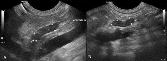 Figure 2 Ultrasound of adrenal glands. A. Right adrenal gland measuring 1.44 x 0.46 x 0.43cm (length x height of cranial pole x height of caudal pole). B. Left adrenal gland measuring 1.12 x 0.36 x 0.33cm (length x height of cranial pole x height of caudal pole).