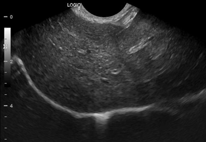 Figure 3 Ultrasound of liver. Liver with enlarged dimensions, rounded edges, high echogenicity and coarse echotexture compatible with liver disease/fatty infiltration.