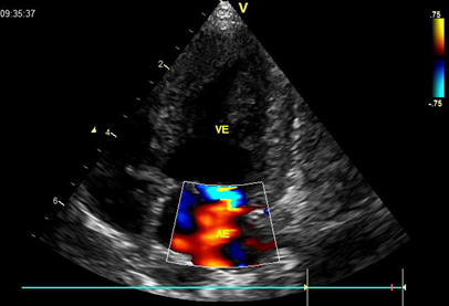 During auscultation, the dog had a heart rate of 141 beats per minute (normal values = 60-160 beats/minute). The Doppler echocardiogram and color flow mapping showed the presence of moderate mitral valve insufficiency (Figure 4).