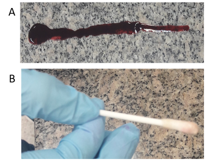 After the preparation of the Kastle-Meyer reagent and the three day wait the tests were started. First, the specificity test was performed to verify that the reagent would be able to identify blood from the different species. To demonstrate this result, photos of the swab were taken after addition of blood, water and the reagent as shown in Figures 2, 3 & 4 below.