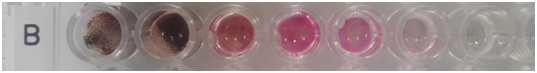 As can be observed, the three species tested showed a positive result after contact with whole blood, Kastle-Meyer reagent and distilled water. Then, a 96-well plate was used to perform the sensitivity test on each species. To this end, whole blood was added to the different lines of the first column of the plate and in the following distilled water was added to serially dilute the blood of the different species in 1:10, 1: 100, 1: 1,000, 1: 10,000 , 1: 100,000 and 1: 1,000,000. The result is shown in Figures 5, 6 & 7 below.