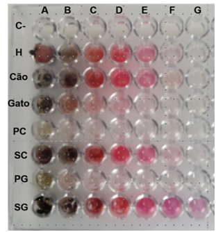 To analyze the ability of the KM reagent to detect the presence of human, canine and feline blood, the blood samples were individually arranged on a smooth non-porous surface and then a flexible rod was moistened with saline and the sample followed by one drop of the Kastle-Meyer reagent and finally one drop of hydrogen peroxide (5%). Teste de sensibilidade. To evaluate the sensitivity of the KM reagent, a 96 well plate was used in which the blood was diluted in distilled water in the following concentrations: 1:10, 1: 100, 1: 1000, 1: 10000, 1: 100.000 and 1 : 1000000 and then subjected to the test procedure.