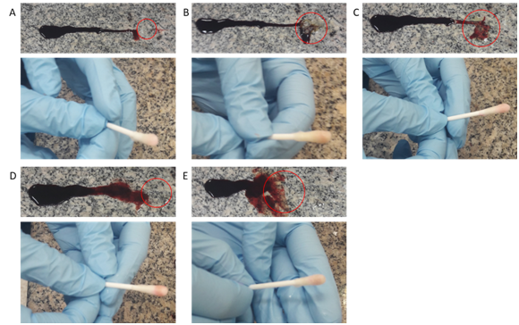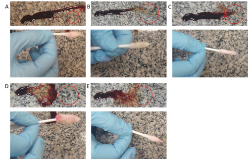 Figure 11 Cat Blood - (A) Blood cleansing with water and swab. (B) cleaning the blood with hypochlorite and swab. (C) blood cleaning with 70º alcohol and swab. (D) blood cleansing with anionic surfactant and swab. (E) blood cleansing with quaternary ammonia and swab.