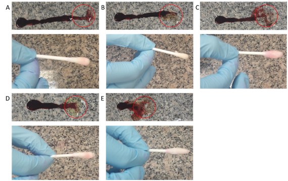 Figure 9 Human blood - (A) blood cleansing with water and swab. (B) cleaning the blood with hypochlorite and swab. (C) blood cleaning with 70º alcohol and swab. (D) blood cleansing with anionic surfactant and swab. (E) blood cleansing with quaternary ammonia and swab.