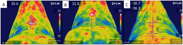 (A) Thermographic image at baseline with intersection indicating temperature of 35.6 °C, suggestive of inflammation;Chinese name |