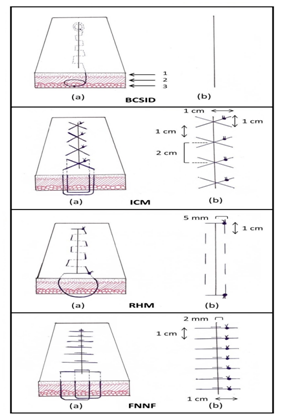 Figure 2 Schematic diagram illustrating the dimensions of each suture pattern in the skin. BCSID: buried continuous subcuticular intradermal, ICM: interrupted cruciate mattress, RHM: running horizontal mattress, FNNF: far–near–near–far, (1) epidermis, (2) dermis, (3) subcutis, (a) suture course, (b) external view.