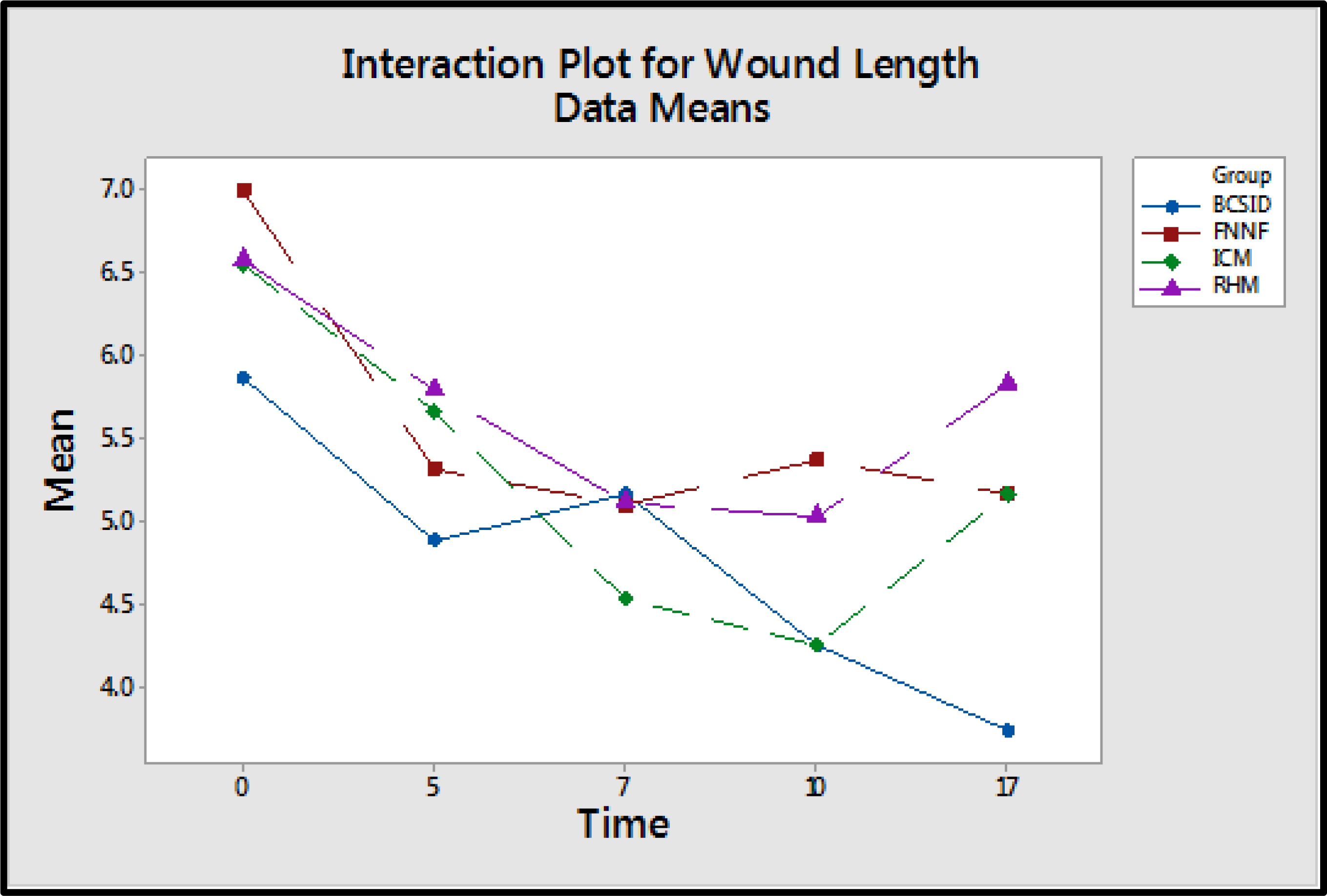 Figure 4 An interaction plot displaying a potential interaction between the suture techniques and the time of wound healing. It shows that the wound length averages of the techniques are different and the performance of the techniques changes over different postoperative days (PODs 0, 5, 7, 10 and 17).