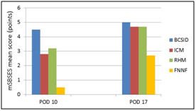 Figure 5 Chart illustrating comparative results for the cosmetic outcomes of wound scars expressed by the mean scores of mSBSES for each suture pattern on PODs 10 and 17.